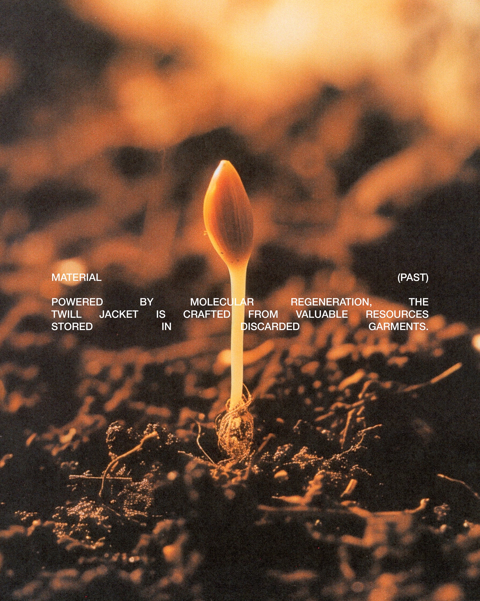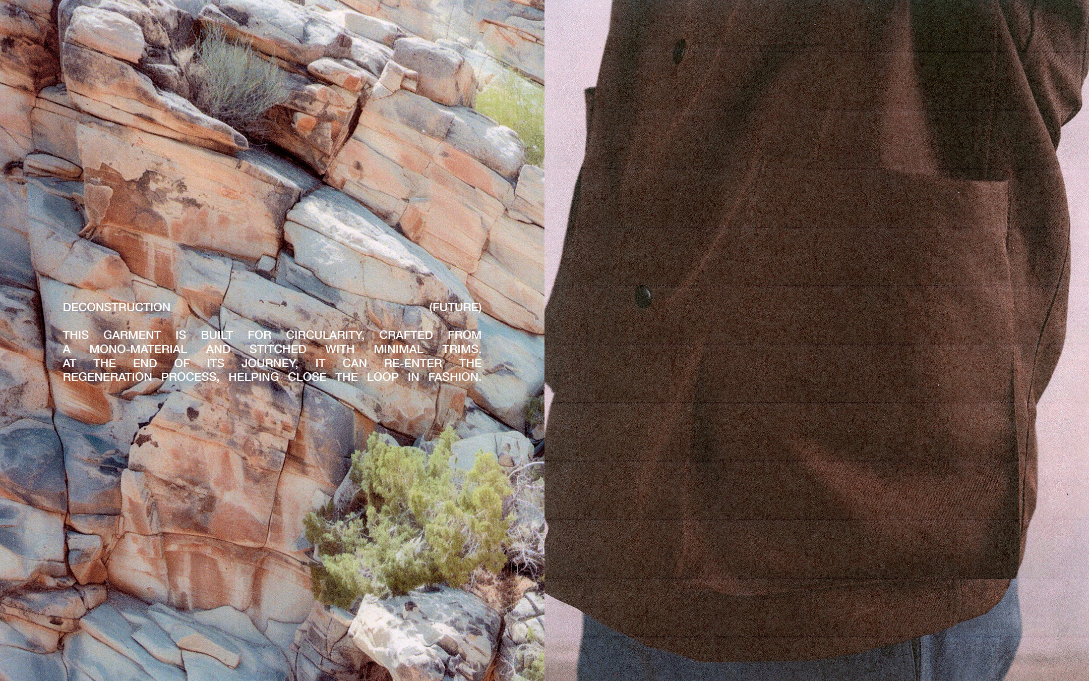 our first experiment was created in 2024, designed under the same roof as our laboratory. made from clothing diverted from Los Angeles landfills that have been regenerated to offer resilient strength, the Twill Jacket is a proof of concept for the future of our clothes. available in limited quantities.