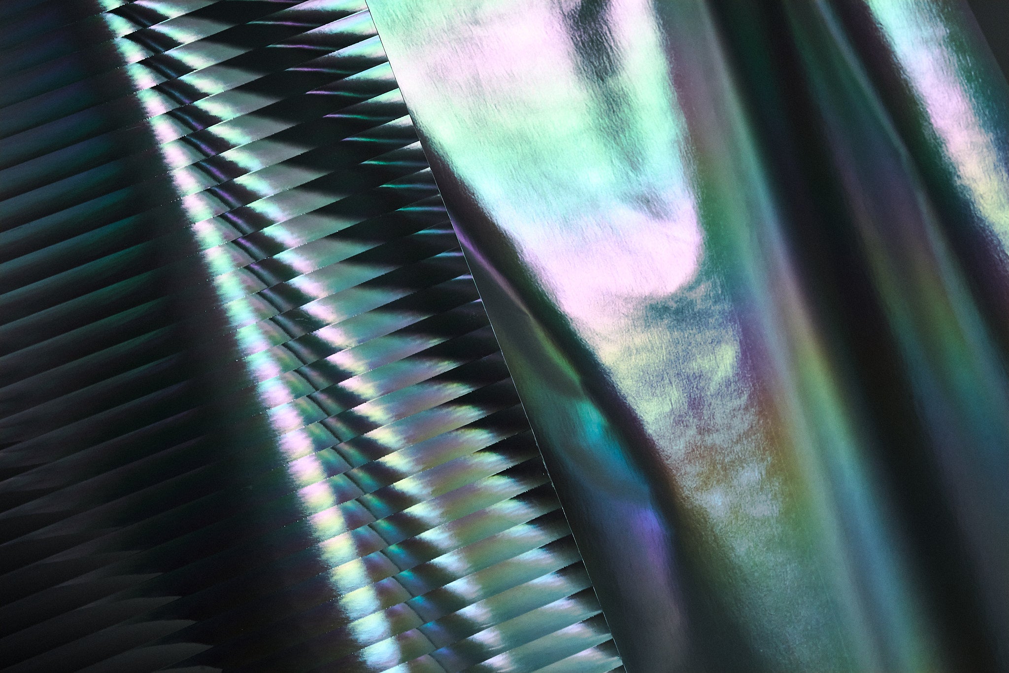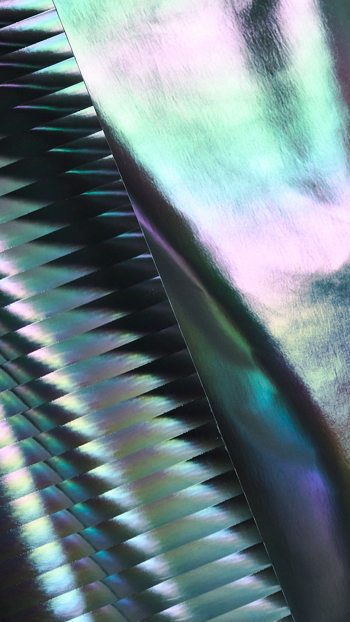 a delicate blue base, finished with an iridescent hologram foil that shifts with movement. infused with a subtle rainbow sheen, it captures the full spectrum of light, revealing prismatic flashes with every angle. inspired by the way sunlight refracts through the atmosphere, this color mirrors the shimmering, ever-changing hues of the sky at dawn.